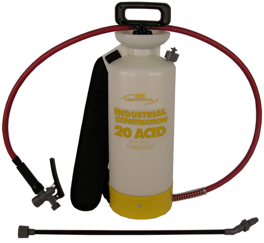 The 20ACID sprayer will not be damaged by muriatic (hydrochloric) acid, hydrofluoric acid, or phosphoric acids and therefore it can be used for staining or etching concrete and masonry, dissolving rust or scale on metal surfaces, cleaning, degreasing, and removing graffiti.