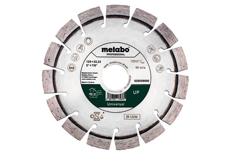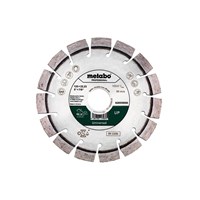 The Metabo Diamond Cutting Disc 125x22.23mm, "UP", Universal Professional (628559000) is a powerful segmented-edge disc designed for fast and aggressive cutting of hard materials. It is particularly suited for general construction materials, including concrete, exposed aggregate concrete, hard and soft sandstones, and clay tiles. The disc features clean cutting edges and high cutting speed, thanks to its special short teeth segments.