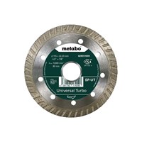 The Metabo Diamond Cutting Disc SP - UT, 115x22.23 mm (628551000) is a universal diamond cutting disc with a closed edge for comfortable cutting. It is well-suited for all building materials, including concrete, exposed aggregate concrete, hard sandstone, and clay tiles. The disc features a segment height of 10 mm, ensuring clean cut edges without material breakage
