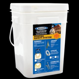 Werner roofing kits contain all of the fall protection products necessary for safe working and code compliance for roofing applications. The system is easy to install and use on a variety of roof pitches. Kit includes a Litefit harness with pass-through buckle leg straps, reusable roof anchor, 30' poly-dac rope, and a manual rope grab with an integrated 3' shock absorbing lanyard, packaged in a waterproof bucket.