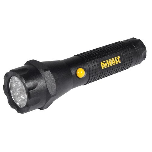 LED Laser, 15 LED Bulb Cluster and Center Laser Pointer. Regulated Electronic Circuitry maximizes light output and extends battery runtime. Rubber O-Ring Seals provide moisture resistance. Tempered Glass Lens resists impact and scratches. 15 LED Bulb Cluster produces a bright light. Hexagon Head prevents light from rolling. Three setting side switch. Click one: 15 LED Bulbs, Click two: 15 LED Bulbs & Laser Pointer, Click three: Laser Pointer Only. Anodized Aluminum DEWALT® Grip Pattern resists corrosion, crushing, and provides a no-slip grip.