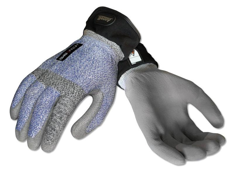 The Ansell ActivArmr 97-006 Dyneema carpenter glove, extra large, protects hands against cuts and abrasions, has a polyurethane palm coating that offers greater wear resistance than leather and facilitates gripping tools, and is knit from Dyneema fiber for strength and durability. Dyneema fiber, also known as UHMWPE (ultra-high molecular weight polyethylene) fiber, offers greater cut protection than leather, greater abrasion resistance than aramid fibers, and greater strength than steel. Ansell's knitted variable stitch design (KVSD) provides a barehanded feeling and breathability. The cuff has a slip wrist design, an adjustable wrist closure for comfort, and an ID nameplate on inner cuff for personal identification. This glove meets American National Standards Institute (ANSI) and International Safety Equipment Association (ISEA) 105-2005 performance rating standards for Level 2 cut resistance. It is suitable for use in working with wood, nails, metal, and power tools, as well as cutting, fastening, and carving wooden objects.