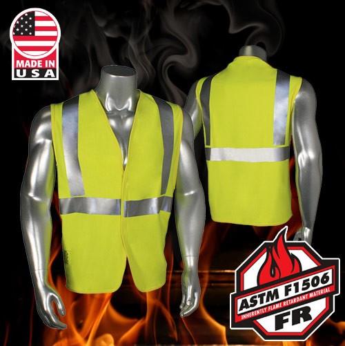 Radians Jersey Knit Modacrylic FR safety vest features a velcro closure with no pockets.  The vest is intended for situations requiring high visibility and (including but no limited to) FR hazards for which FR material should be and often is required. Typical application would be NFPA 70E work environments; Utilities, Electrical, or Mechanical construction.