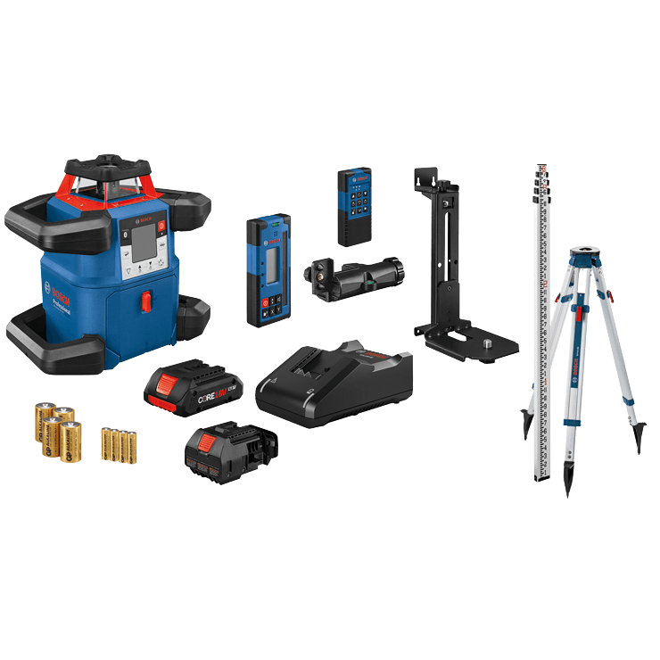 (1) GRL4000-80CHV 18V REVOLVE4000 Connected Self-Leveling Horizontal/Vertical Rotary Laser (1) LR40 Laser Receiver with Bracket (1) GBA18V40 18V CORE18V Lithium-Ion 4.0 Ah Compact Battery (1) 18V Battery Charger (1) BA1 Alkaline Battery Adapter (4) D Batteries (4) AA Batteries (1) BT170 Heavy-Duty Aluminum Tripod (1) GR13 13 Ft. Grade Rod (1) WM6 Wall Mount (1) RC5 Remote Control (1) Carrying Case
