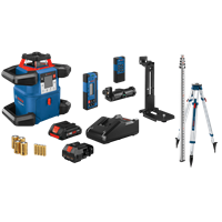 Fully featured rotary laser – has Dual Dial-In Slope, CORE18V power, Bluetooth® connectivity, uCAL user-calibration and more Dual Dial-In Slope – allows slope angle adjustment on both the X and Y axes Dual Power Source – for extended runtime and option of a 4.0 Ah CORE18V battery or a battery adapter with four (D) cell batteries Durable design – engineered with a cage rubber overmold and an innovative handle design to stand up to the toughest jobsites; built to IP68 dust- and water-protection standards Bluetooth® connectivity – connects to a mobile device, linking to the free Bosch Leveling Remote App, to control sleep mode, Dual Dial-In Slope, and more uCAL – user-calibration guiding the user step-by-step to confirm tool status or calibrate the rotary laser to ensure accuracy on the jobsite Long working range – range of up to 4,000 Ft. with laser receiver, the laser accuracy of up to ±1/16 In. at 100 Ft. in horizontal mode and ±1/8 In. at 100 Ft. in vertical mode Vertical-beam functionality – provides a vertical beam at 90° point for layout, squaring and plumb applications Electronic self-leveling – allows for easy setup and use on the job Disturbance monitor – indicates if tool position changes, ensuring consistent leveling accuracy Variable-speed and scan-angle selection – allows for maximum visibility at different lighting conditions Comprehensive kit – includes a remote control, 18V 4.0 Ah battery and charger, alkaline battery adapter, wall mount, laser receiver, aluminum tripod, sturdy grade rod and durable hard carrying case